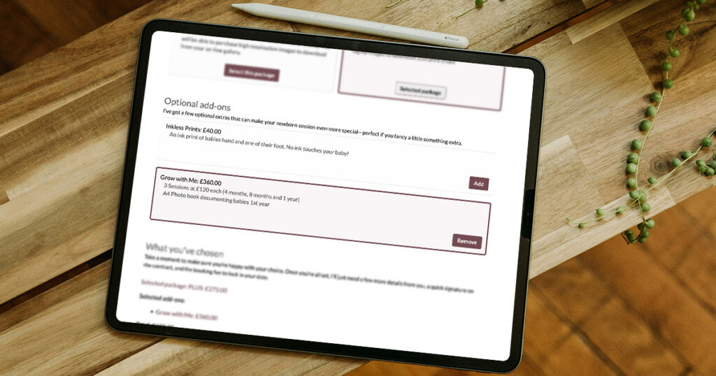 For many photographers, selling packages, add-ons, and upgrades can feel clunky. It often relies on follow-up emails, phone calls, or trying to revisit the conversation later when the moment has already passed.