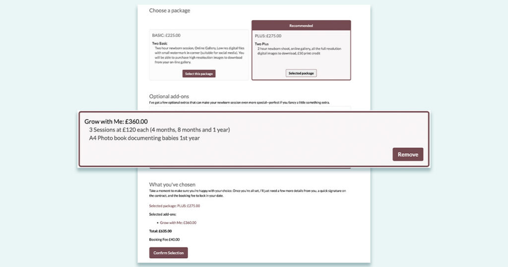 Clients choose between her core packages (typically a “basic” or “plus” option) and then simply select any extras they’d like.